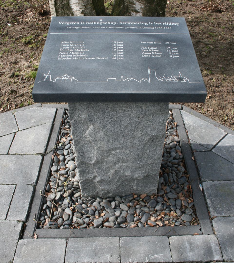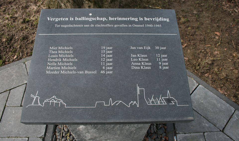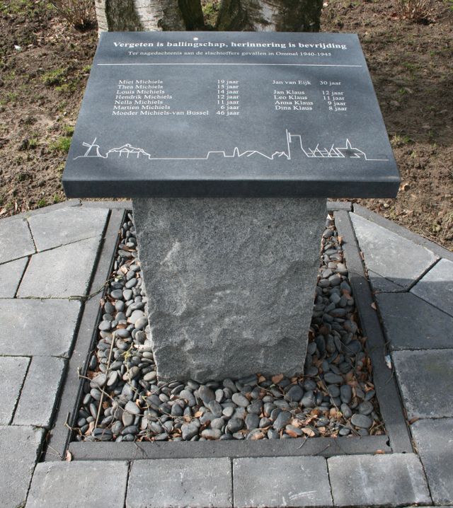 Das Denkmal besteht aus einem 1 Meter hohen Steinsockel, auf dem eine Plakette mit der Skyline von Ommel angebracht ist. Darauf sind auch die Namen der 12 Einwohner von Ommel eingraviert. Jan, Leo, Anna und Dina Klaus; Martien, Theo, Louis, Hendrik, Miet, Nella und Helena Michiels; sowie Jan van Eijk, Wehrpflichtiger.