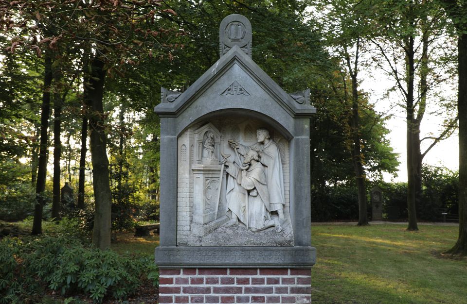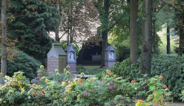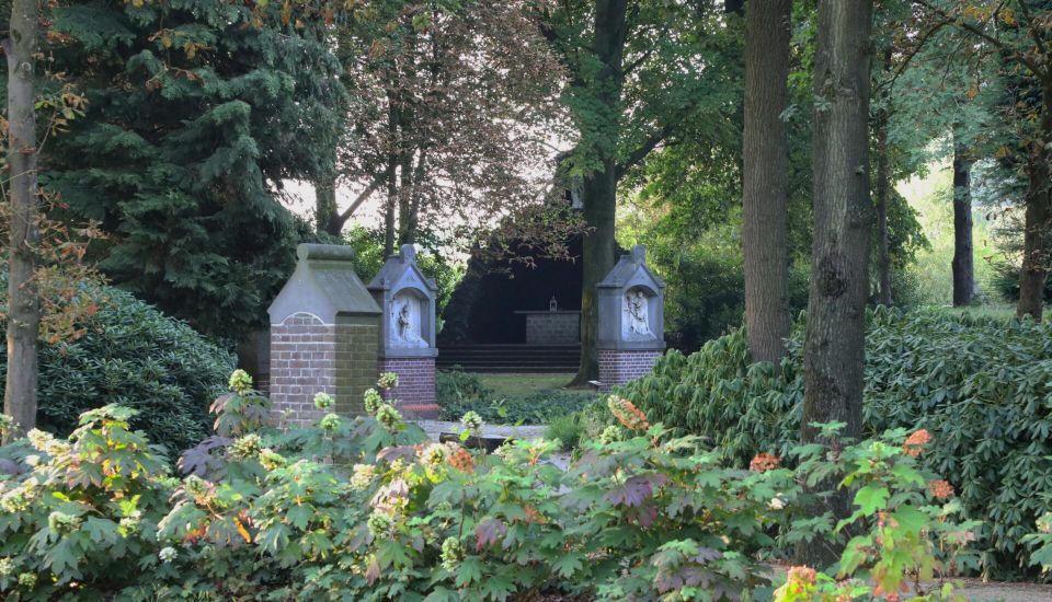 Der äußere Ring dieses Parks enthält einen Kreuzweg aus Sandsteinrelief. Die 14 Stationen sind in Form von "Keskes"/Kapellen angeordnet, die 1914 im neugotischen Stil errichtet wurden. Jede Kapelle besteht aus einem niedrigen Backsteinaufbau auf einem Sockel, der leicht aus dem Aufbau herausragt und eine Abdeckkante aus hart gepresstem Stein hat. Der Überbau hat eine Nische unter einem Segmentbogen, an deren Vorderseite jeweils ein Natursteinflansch sichtbar ist. Über der Nische befindet sich ein Giebeldach aus Naturstein mit Giebelabschluss. In einem kastenförmigen Feld ist die Nummer der Station in römischen Ziffern angegeben. In der Nische befindet sich eine weiße Natursteinskulptur, teilweise im (Hoch-)Relief. In die Seitenwände jeder Kapelle sind Steintafeln eingelassen, die darauf hinweisen, dass die Kapellen von verschiedenen prominenten Bürgern gestiftet wurden. Die erste Station befindet sich links des niedrigen Zauns, an der Vorderseite des Parks. Die übrigen Kreuzwegstationen folgen auf der linken Seite.
