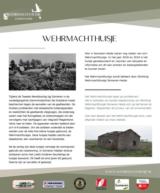 It ran from northern to southern Denmark and went from northern Germany via the Netherlands, Belgium and eastern France to the Swiss border. The first version of the Kammhuber Line consisted of a series of radar stations with overlapping radio coverage and built in three layers. Each station provided radar coverage of 32 km high (North-South) and 20 km wide (East-West). In addition, large Searchlights were placed along the entire line. Small houses were built near the searchlights to house the soldiers in the Kammhuber Line. Broadly speaking, they were the same houses across the board. The houses could differ from each other only in a few details. The houses had a size of about 8 x 5 meters and there were 4 rooms in them. You can talk about a hall, a kitchen, a living room and a bedroom. Usually 6-8 soldiers stayed in a Wehrmacht house. After the war, the houses were often used as emergency housing due to a housing shortage. Several families, often with many children, made use of such a Wehrmacht house.