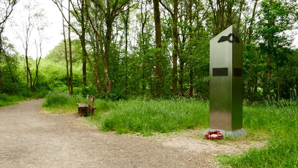 This brushed stainless steel monument with bronze plaques was erected in memory of all aircraft crew members who lost their lives in De Peel during the Second World War. The text is written in three languages. The monument was made by Firma Joppen from Beringen, and the plaques were made by Royal Eijsbouts, the bell foundry in Asten. You'll find this monument in the Groote Peel, at the start of the walking route. The monument has been there since 2003.
