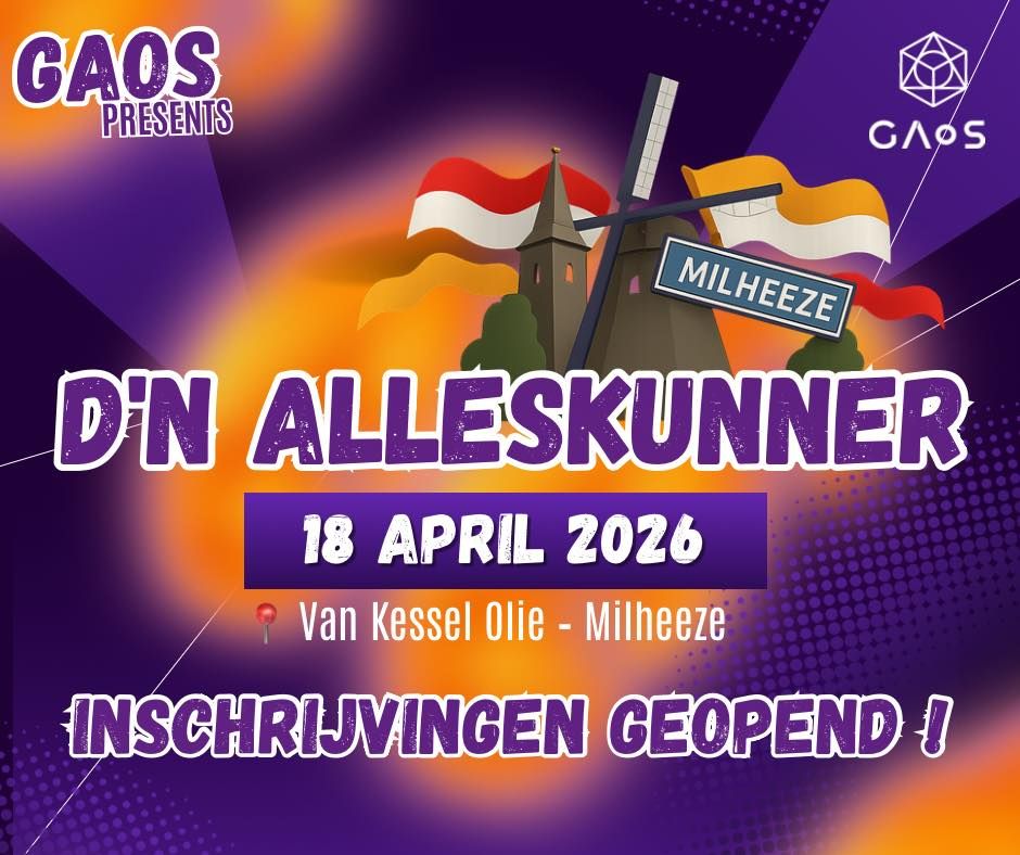Op 18 april 2026 organiseren we een indoor editie van D’N ALLESKUNNER, geïnspireerd op het bekende tv-programma. Een dag vol hilarische minigames, spanning en gezelligheid voor jong & oud! Vanaf 11:00 uur: kindereditie Vanaf 15:00 uur: 18+ editie Afsluitend een feestavond met live band & DJ’s! Teams van 4, 5 of 6 personen strijden in korte, uitdagende minigames om de titel D’N ALLESKUNNER, fantastische prijzen én eeuwige roem Na de teamrondes nemen de beste deelnemers het individueel tegen elkaar op in de finale. Zaterdag 18 april 2026 Van Kessel Olie – Milheeze Vrij toegankelijk voor publiek Eten, drinken, entertainment en feest: alles is geregeld om er een gezellige dag van te maken! Inschrijven kan via onderstaande link rdtickets.nl/shop/gaos