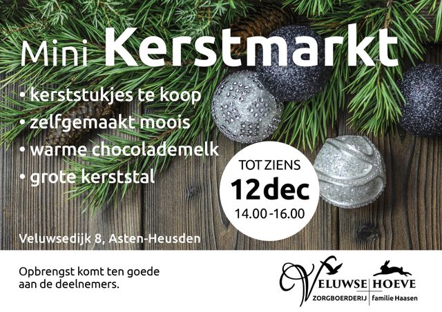 Op vrijdag 12 december organiseert zorgboerderij 'De Veluwsehoeve' een (mini)kerstmarkt van 14.00-17.00. Iedereen is welkom om de gezellige (kerst)sfeer te proeven, een kijkje te nemen op onze boerderij en zelfgemaakte kerstartikelen te kopen!