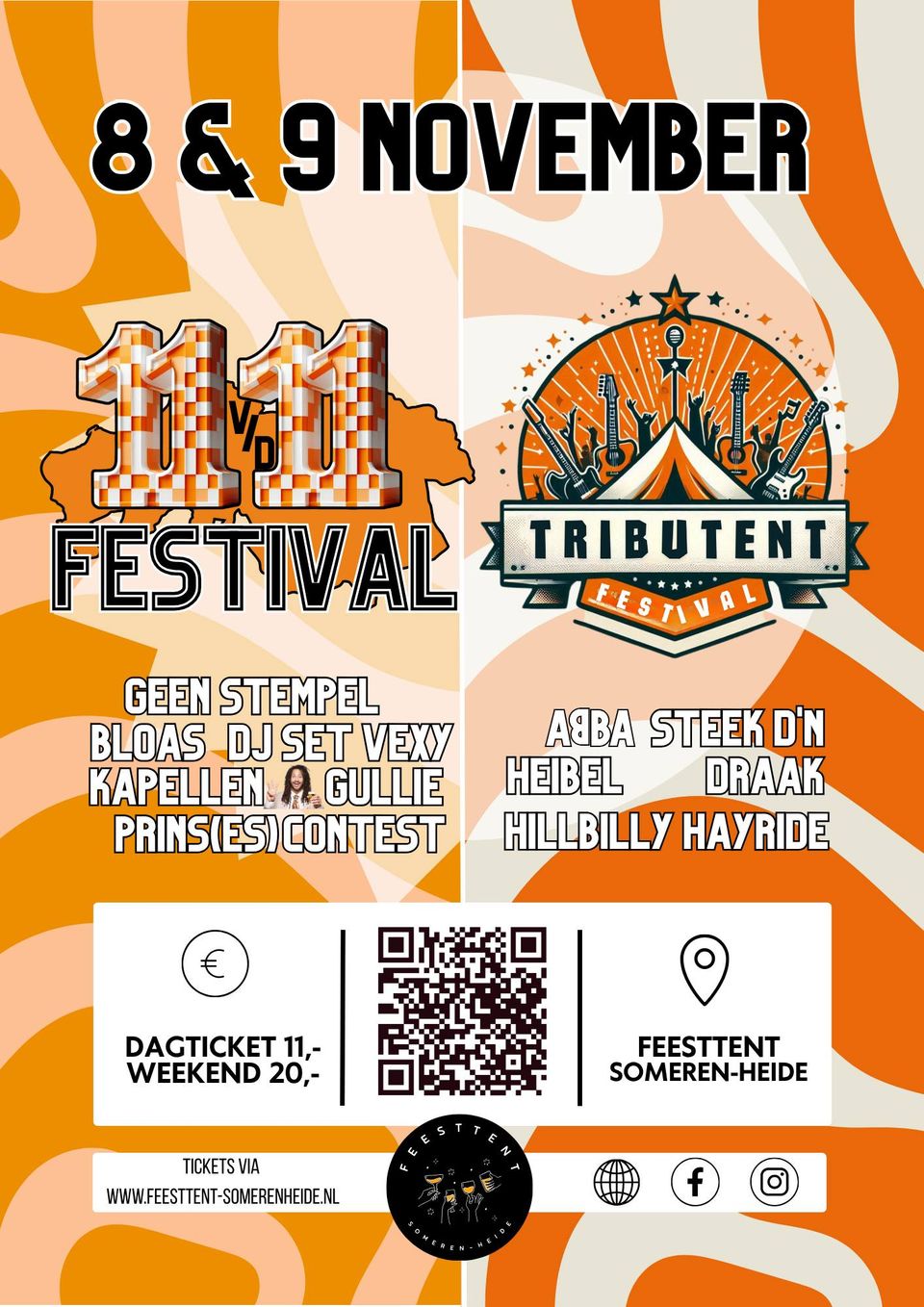 Zaterdag 8 november – Elfde van de Elfde Festival Start: 15.00 uur  Optredens: Huis-DJ Set Vexy, Gullie, Geen Stempel + bloaskapellen Special: Prins(es)contest – wie wordt de hoogheid van het festival? Inschrijven voor de contest kan via feesttent-somerenheide.nl