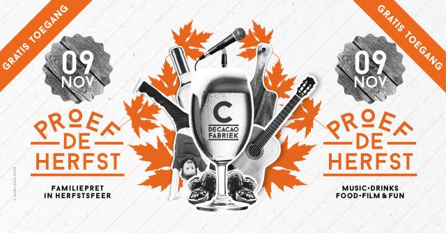 Op zondag 9 november organiseert De Cacaofabriek Proef de Herfst. Een middag waar muziek, smaak en gezelligheid samenkomen. Kies jouw favoriete herfsthapje in onze kraam. Geniet onder andere van paddenstoelen, stoofvlees en warme appeltaart. Ook aan een goed glas drinken is geen gebrek: speciaalbier met karakter, een heerlijke wijnproeverij of warme/koude drank. Voor de kids is er een kidscorner met fijne films, een ballonnenclown, een schminkhoek, een springkussen, dansworkshop en spellen.