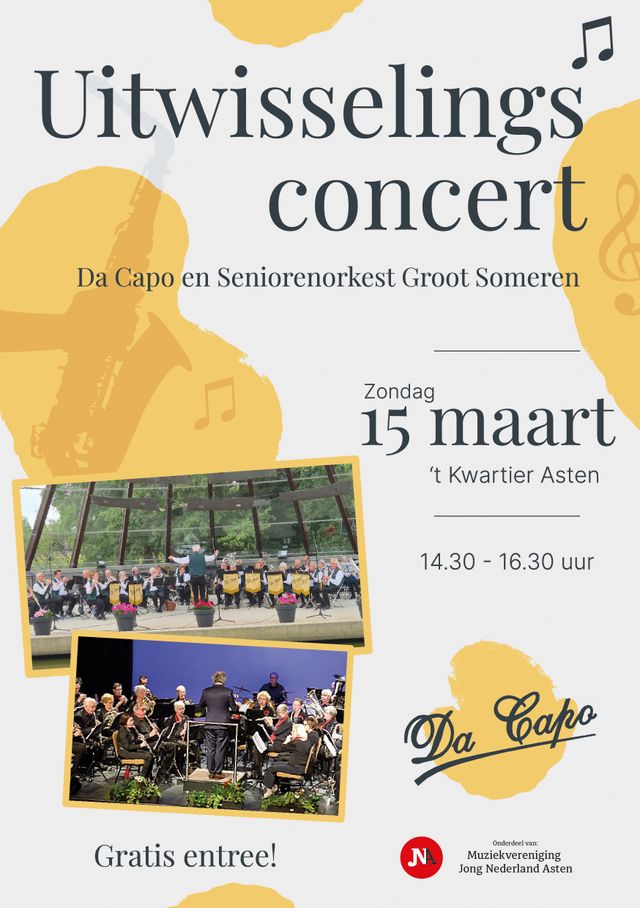 Van 14.30 tot 16.30 uur optreden van Da Capo met Seniorenorkest Groot Someren in 't Kwartier. Gratis entree