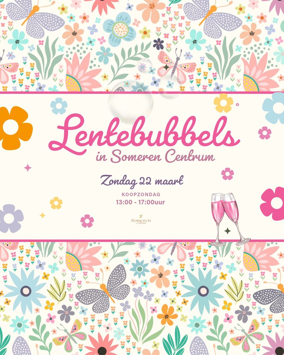 LENTEBUBBELS in Someren Centrum Zet ‘m in je agenda! Zondag 22 maart van 13.00 – 17.00 uur  De winkels zijn open en wij zorgen voor de bubbels! Deze winkels doen mee: KIXX D-Reizen Wout van Vlerken Kadoshop van de Plank Van der Weerden Hema Thijssen Sport La Dunga mode Livera New York Pizza Blauw Juniorstore Bloom Fietsgemak Meulendijks Juwelier Herman Geurts Kruidvat Wibra Norah Mode   Kom gezellig shoppen, borrelen, rondstruinen en genieten van de eerste lentevibes Wij tellen alvast af..