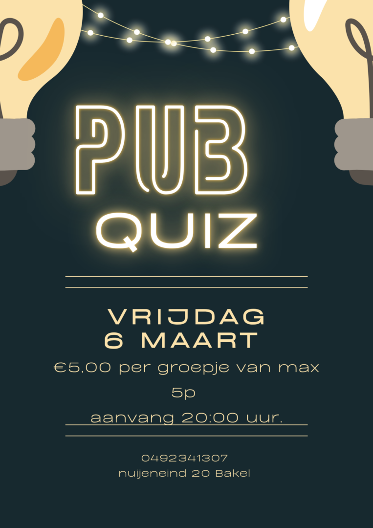 Pub quiz 6 maart €5,00 per groepje max 5 personen. Bent u met meer? Geen probleem! Splits dan op in twee of meer groepjes.