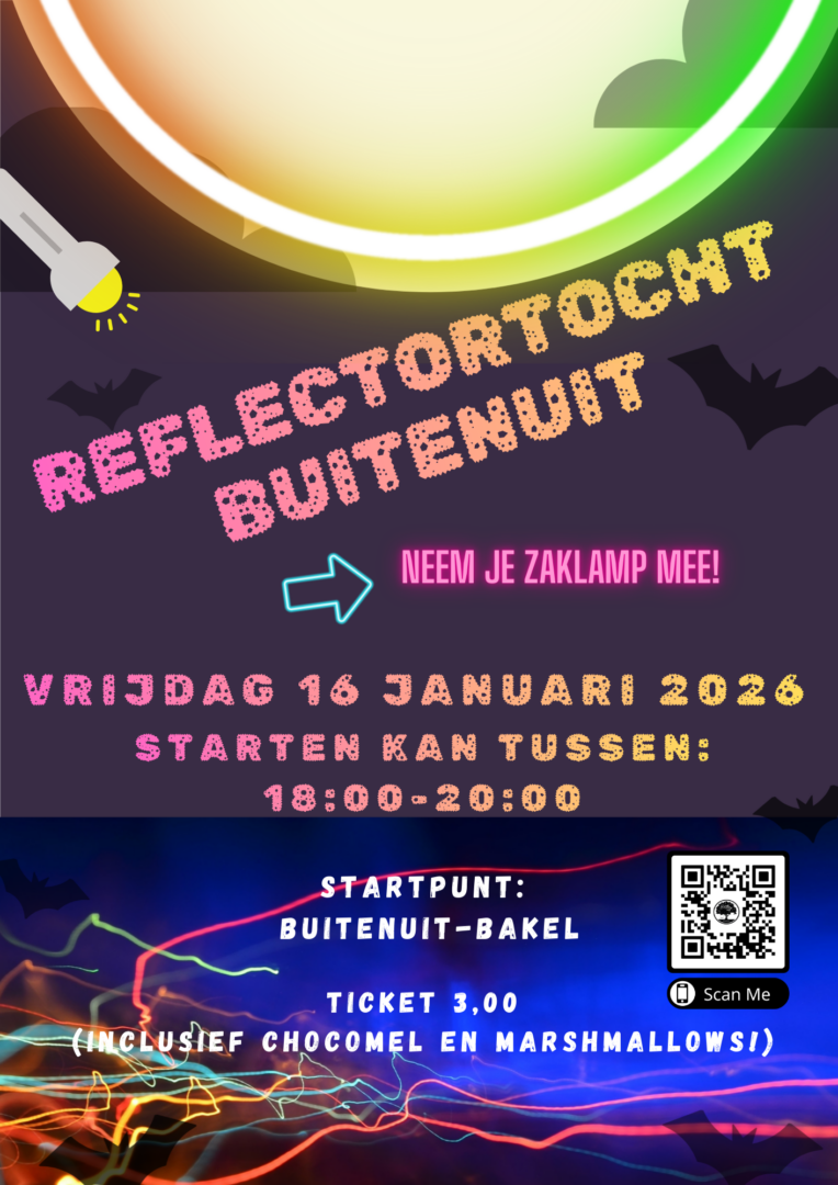 Via het startpunt bij Buitenuit ga je op pad door het bos, gewapend met zaklamp op zoek naar reflecterende aanwijzingen! Met deze aanwijzingen volg je de route. Onderweg zijn er enkele posten met leuke opdrachten. Kom je mee speuren?! Wie weet, wat je allemaal tegenkomt!! Starten kan vanaf 18:00 en tot 20:00u Een ticket is te koop via de website of de QR. Ticket is inclusief warme chocomel én marshmallows!