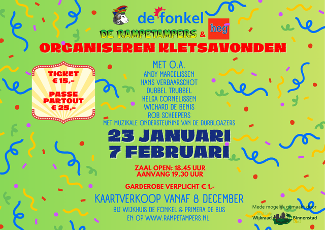 Door de samenwerking van de Helmondse Enterteenmunt Groep (HEG), de Fonkel, de Rampetampers en Stichting Wijkbeheer Binnenstad Oost zijn er weer 2 gevarieerde kletsavonden in de Fonkel. Op vrijdag 23 januari zal de eerste kletsavond worden gehouden en zaterdag 7 februari de tweede. Op elke avond stappen 4 kletsers in de ton en treden er 2 amusementsgroepen op.