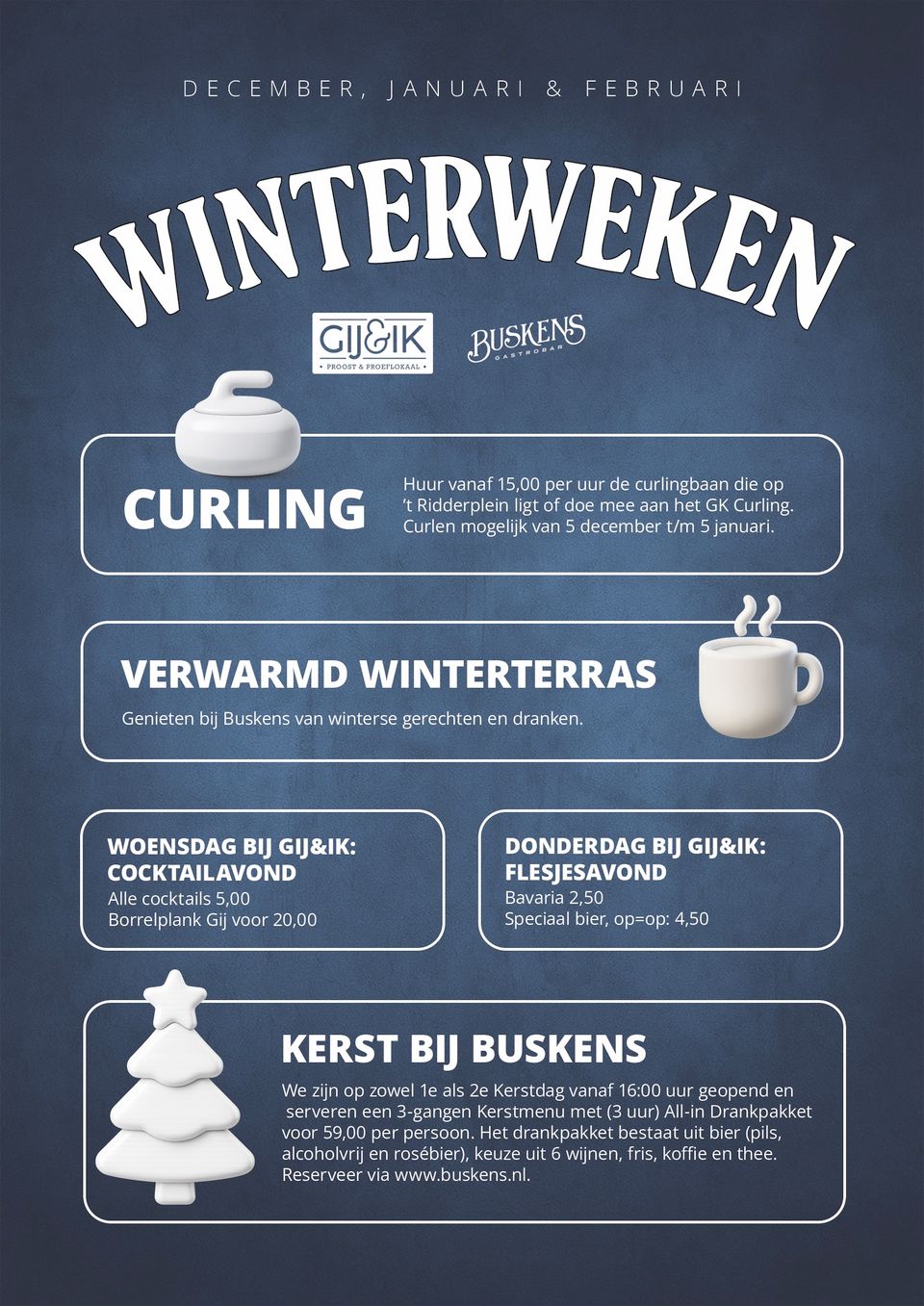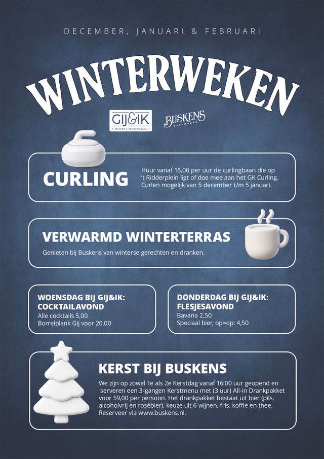 Van 5 december t/m 5 januari ligt er op het Ridderplein een échte curlingbaan, die per uur te huur is. Op het overdekte en verwarmde winterterras van Buskens zit je er deze maanden warmpjes bij. De stoelen zijn uitgerust met verwarmende kussens, voor die extra warme kont. Omringd door winterse sferen geniet je hier van lunch, diner of een borrel, met perfect uitzicht op de curlingbaan op ’t Ridderplein.