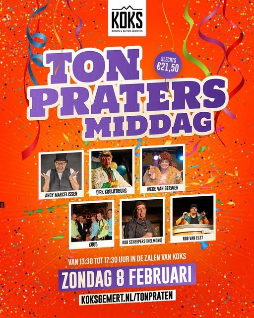 Op 8 februari een tonpratersmiddag met optredens van Andy Marcelissen, Dirk Kouliejenburg, Iveke van Gerwen, Kuub, Rob van Elst en Rob Scheepers(Helmond).