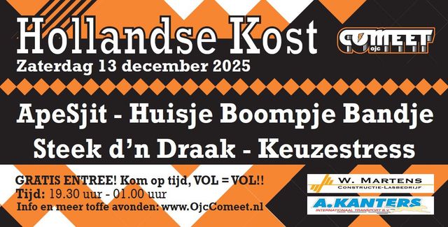 Someren, Zaterdag 13 december 2025 – Het wordt weer smullen geblazen voor liefhebbers van livemuziek van eigen bodem: OJC Comeet in Someren organiseert op zaterdag 13 december de derde editie van Hollandse Kost. Dit inmiddels vaste onderdeel van de Comeet-agenda staat garant voor een avond vol energie, gezelligheid en stevige Hollandse klanken.