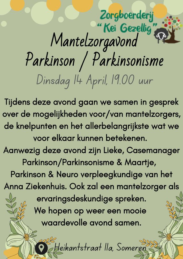 Op dinsdag 14 april hebben we op Zorgboerderij Kei Gezellig weer een mooie mantelzorgavond op de planning staan. Ditmaal met als thema Parkinson & Parkinsonisme. Er komen mooie, waardevolle sprekers met als hoofddoel van de avond wat kunnen we voor elkaar betekenen. Zien we u ook?!