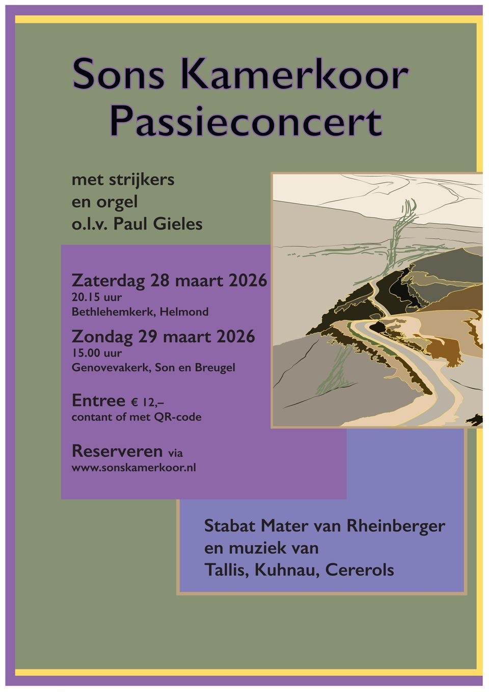 De concerten zijn op zaterdagavond 28 maart in Helmond (20.15 uur) in de Bethlehemkerk en op zondagmiddag 29 maart in Son en Breugel (15.00 uur) in de Genovevakerk. Het concert duurt ruim een uur. De entree is €12, aan de zaal contant (liefst gepast) of met QR-code te voldoen.