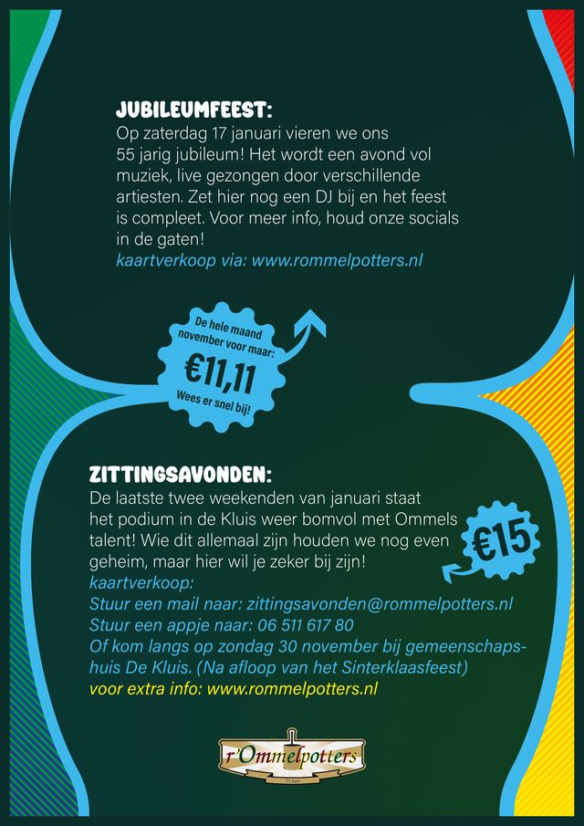 Staat het podium weer bomvol met Ommels talent. De optredens zijn in De Kluis, Kluisstraat 24 5724 AD Asten-Ommel. Entree € 15.00. Voor de kaartverkoop stuur een mail naar zittingsavonden@rommelpotters.nl. Voor extra info: www.rommelpotters.nl