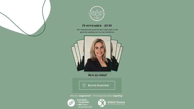 Bent u erbij? Meld je aan via de link: https://forms.gle/EfxKnXkJNaPDH5TS9 Volg ons op Instagram voor meer informatie: @sixpackbakel & @dietistdenise