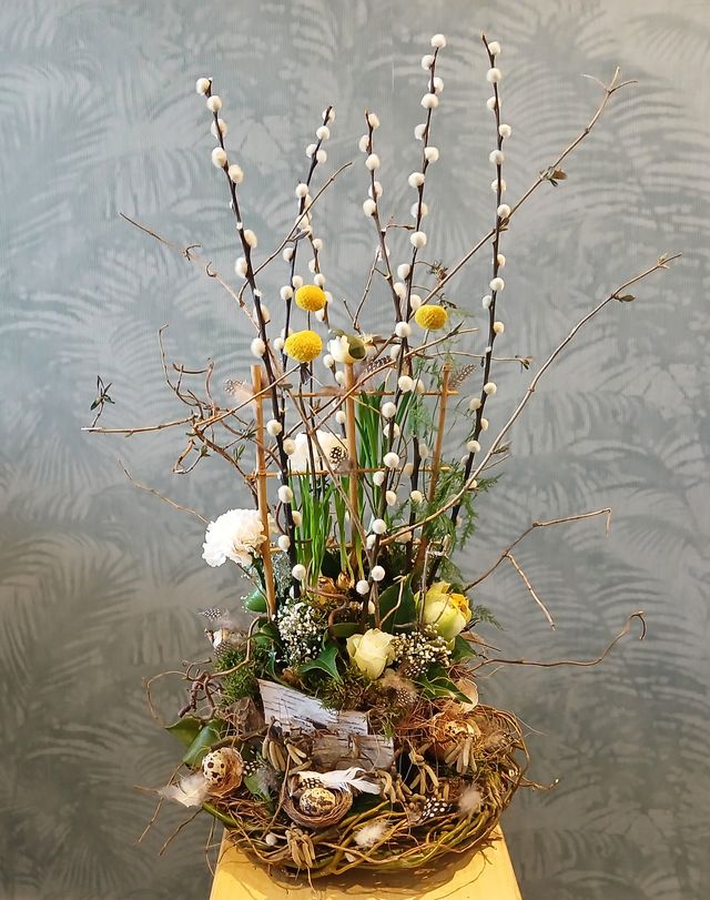 Decoratief voorjaarsbloemstuk met natuurlijke materialen