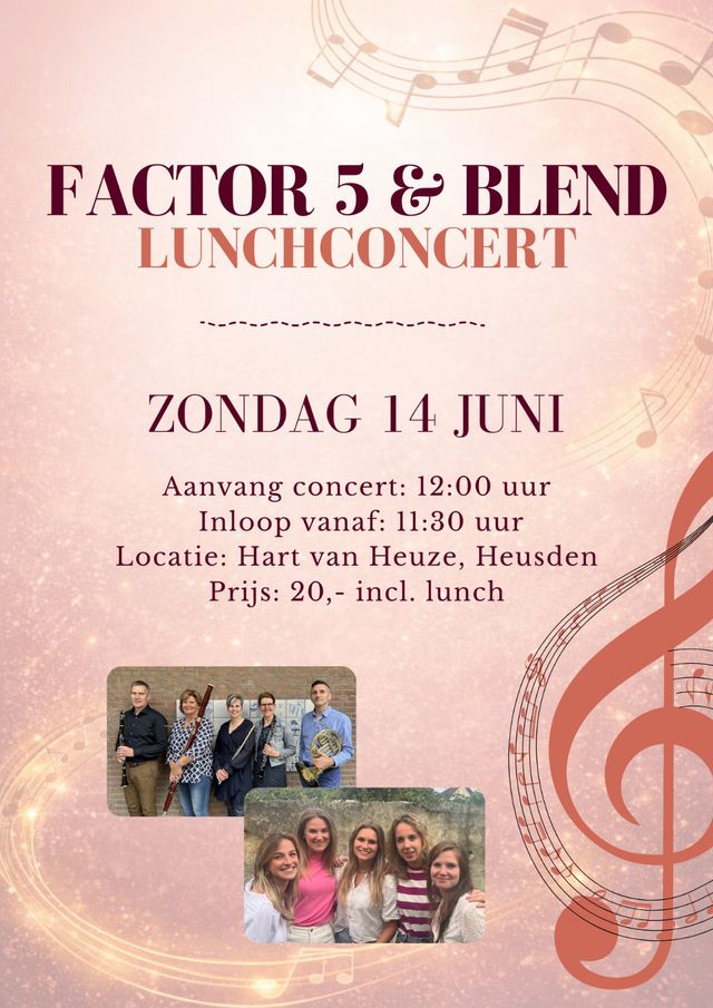 Op zondag 14 juni vloeien bourgondische gezelligheid en muziek samen in het Hart van Heuze. Het houtblazerskwintet Factor 5 en zanggroep Blend slaan de handen ineen voor een sfeervol lunchconcert. Bezoekers kunnen genieten van een gevarieerd programma waarin licht klassiek repertoire en populaire popsongs elkaar afwisselen, geserveerd naast een lekkere lunch.