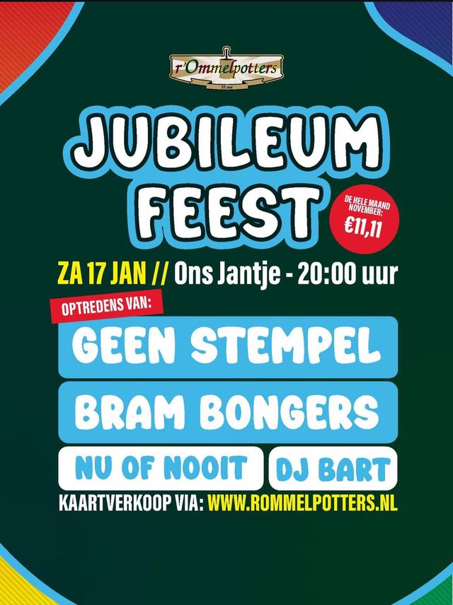 Een geweldig feest bij De Kluis, Kluisstraat, Asten-Ommel. Een avond vol muziek, live gezongen. Met een DJ dan is het feest compleet. Entree € 11.11. Kaartverkoop via: www.rommelpotters.nl . Optreden van: Geen Stempel, Bram Bongers. Nu of Nooit en DJ Bart