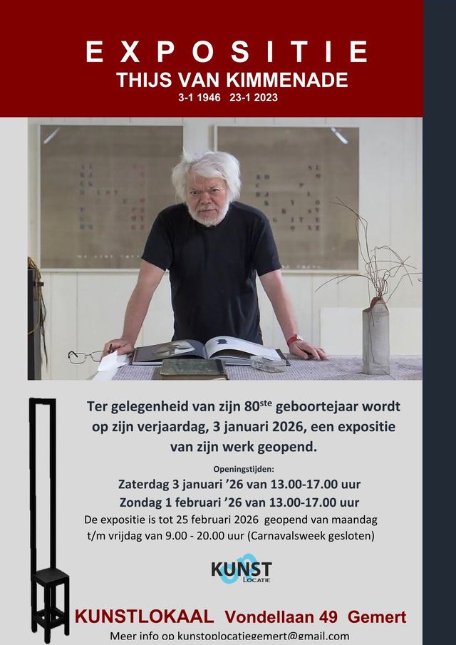 Ter gelegenheid van zijn 80e geboortejaar wordt op zijn verjaardag, 3 januari 2026, een tentoonstelling van zijn werk geopend. Thijs van Kimmenade verwierf internationale bekendheid met zijn kunstwerken. Op de tentoonstelling zijn stalen objecten, foto’s, schilderijen, tekeningen en diverse andere kunstvormen van zijn hand te zien. In de theaterzaal wordt de documentaire “Thijs van Kimmenade, a kind of sculpture” getoond.