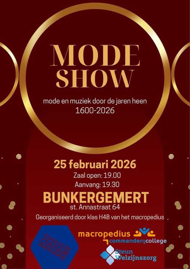 Leerlingen van H4B van het Macropedius college nemen je mee op een tijdreis door de geschiedenis van mode en muziek. We vetrekken vanaf 1600 tot de tijd van nu om in een upcycling modeshow een beeld te schetsen van zowel mode als muziek !!