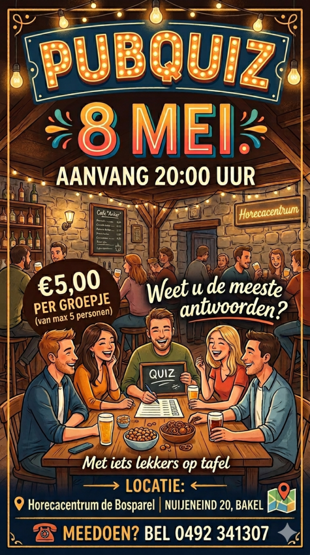 Pubquiz €5,00 per groepje van maximaal 5 personen. Met lekkere dingetjes op tafel.