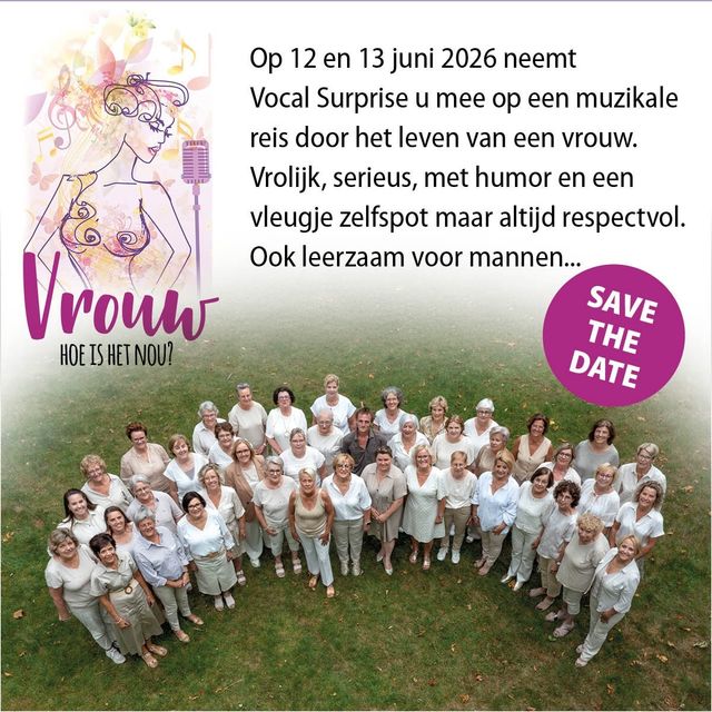 Een Muzikale reis Vocal Surprise door het leven van een vrouw in 't Kwartier. Thema: Vrouw hoe is het nou? Vrolijk, serieus met humor en een vleugje zelfspot maar altijd respectvol.