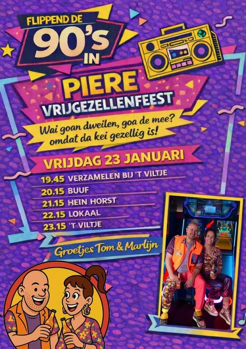Op 23 januari een vrijgezellenfeest van het Pierepaar van de Pierewaaiers. Start bij cafe 't Viltje te Bakel.