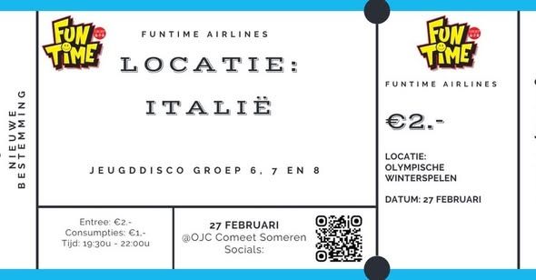 Na de gezellige carnavalsfeesten en Ut Zottengenot is het vrijdag weer tijd voor Funtime! Funtime Airlines neemt je dit keer mee naar Italië, midden in de Olympische Spelen. Samen met je vrienden beleef je een avond vol spannende spellen, waar een echte battle op je wacht. Trek je sportieve outfit aan en doe mee aan deze Italiaanse Olympische uitdaging – deze Funtime wil je niet missen!