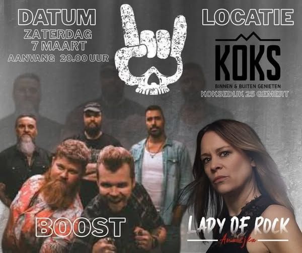 HEERLIJKE ROCKAVOND! Zet zaterdag 7 maart in je agenda en bestel via onderstaande link de kaartjes! https://sales.ticketing.cm.com/boost26 Hier moet je bijzijn! Lekker rocken met de mannen van Boost Rock en als voorprogramma Lady of Rock! HEERLIJKE ROCKAVOND! Zet zaterdag 7 maart in je agenda en bestel via onderstaande link de kaartjes! https://sales.ticketing.cm.com/boost26 Hier moet je bijzijn! Lekker rocken met de mannen van Boost Rock en als voorprogramma Lady of Rock! Op 7 maart een heerlijcke rockavond bij Koks Gemert met Boost en Lady of Rock
