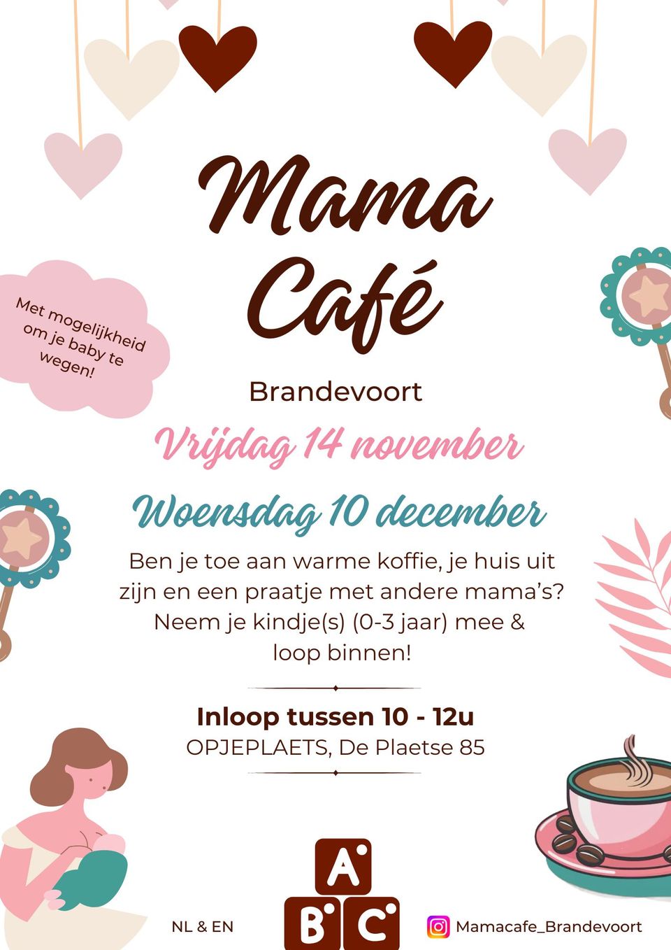 Het Mama Café wordt georganiseerd voor alle mama's in Brandevoort en omgeving, die toe zijn aan warme koffie, eropuit zijn met je kids (0-3 jaar) en een praatje met andere mama's in dezelfde - soms overweldigende - levensfase.