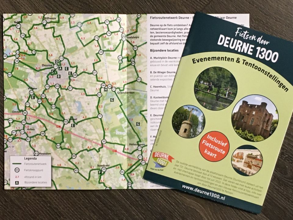 In de folder 'Fietsen door Deurne 1300' stonden naast het vernieuwde fietsnetwerk van Deurne in deze uitgave alle activiteiten, exposities en bijzonderheden over het jubileumjaar Deurne 1300 dat tot juli 2022 duurde.