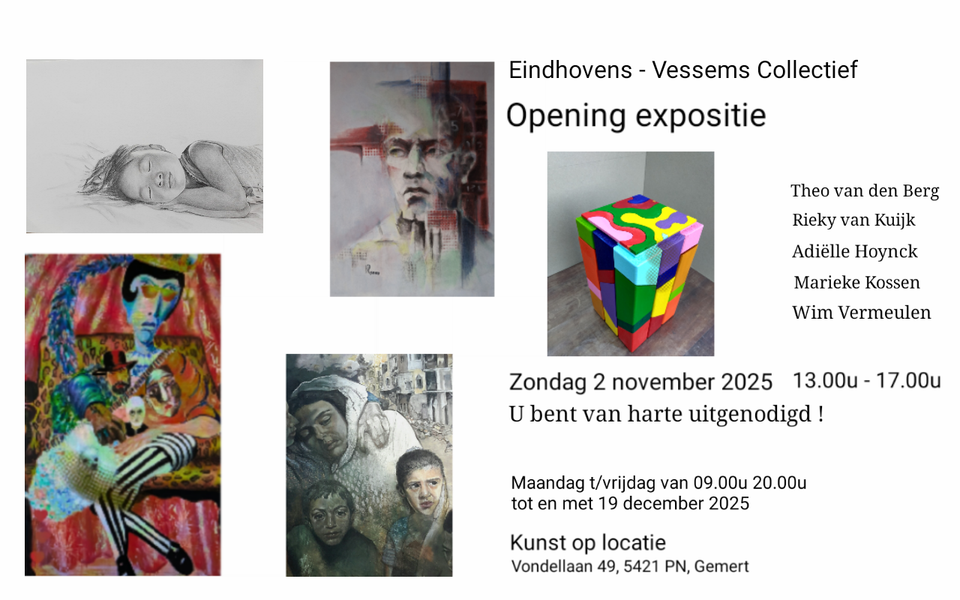 Wij zijn het Eindhovens en Vessem's Collectief, wij werken regelmatig samen om elkaar scherp te houden. Daarnaast werken wij ook vaak samen naar een expositie toe. Ons werk is totaal verschillend in de uitwerking, maar toch zijn er veel raakvlakken te ontdekken.. Zo voelen wij ons allen geïnspireerd door de mens en zijn leefomgeving en werken wij vooral op figuratieve wijze.